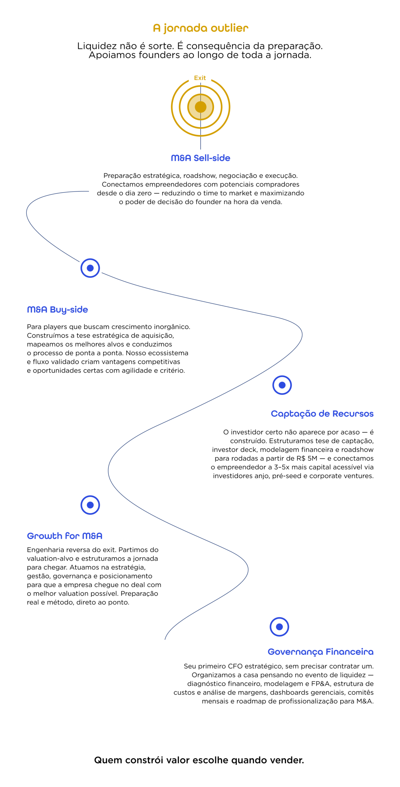 A Outlier Partners é um ecossistema de M&A com assessoria premium especializada em empresas de tecnologia e serviços no lower middle market brasileiro.